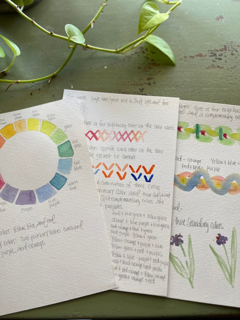 Tomorrow a young friend is coming over to watercolor, and I’m quite excited about it. She needs it for credit for a class in high school, and I hope that this session will not only help her with her coursework but also spark her interest in the world of art and creativity. I’m not sure how much she knows about color theory or if she knows it at all, which makes me a bit nervous, as I want to provide her with a meaningful and enjoyable experience. To ensure we have a productive time, I thought I would paint a color wheel and provide an explanation of primary and secondary colors, as well as how these colors interact with each other in various contexts. We’ll explore different color schemes together, including monochrome, analogous, complementary, split complementary, and complementary analogous, and I’ll encourage her to experiment with creating her own unique color combinations. Additionally, I plan to discuss primary triads and secondary triads, emphasizing how they can be used to create balance and harmony in artwork. I’m looking forward to an engaging and educational experience for both of us, where we can share ideas and learn from each other. I have only taught one watercolor class, but I didn’t add in color theory due to the basic focus of that lesson. Now that I am a little more experienced and understand how vital color theory is for beginners, I feel it necessary to incorporate this foundational knowledge into a lesson so the student better understands how to mix colors effectively and express their vision on paper. Through this creative journey, I hope to inspire her and help her develop her artistic voice as she navigates the world of watercolor.