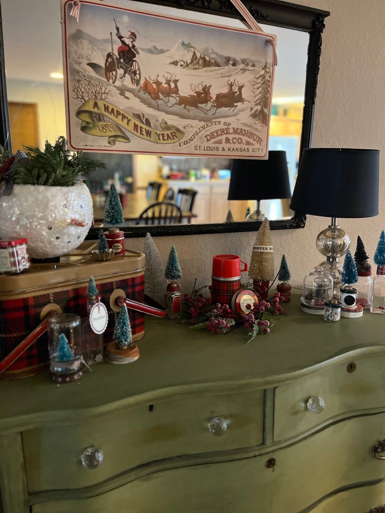 I put my collection of plaid lunch boxes on the dining room table. I added more bottle brush trees, placing them among the boxes, with a snowman and Santa I made a few years ago. Pretty simple, but it makes me happy. And there you have it my decorations for Christmas 2024.