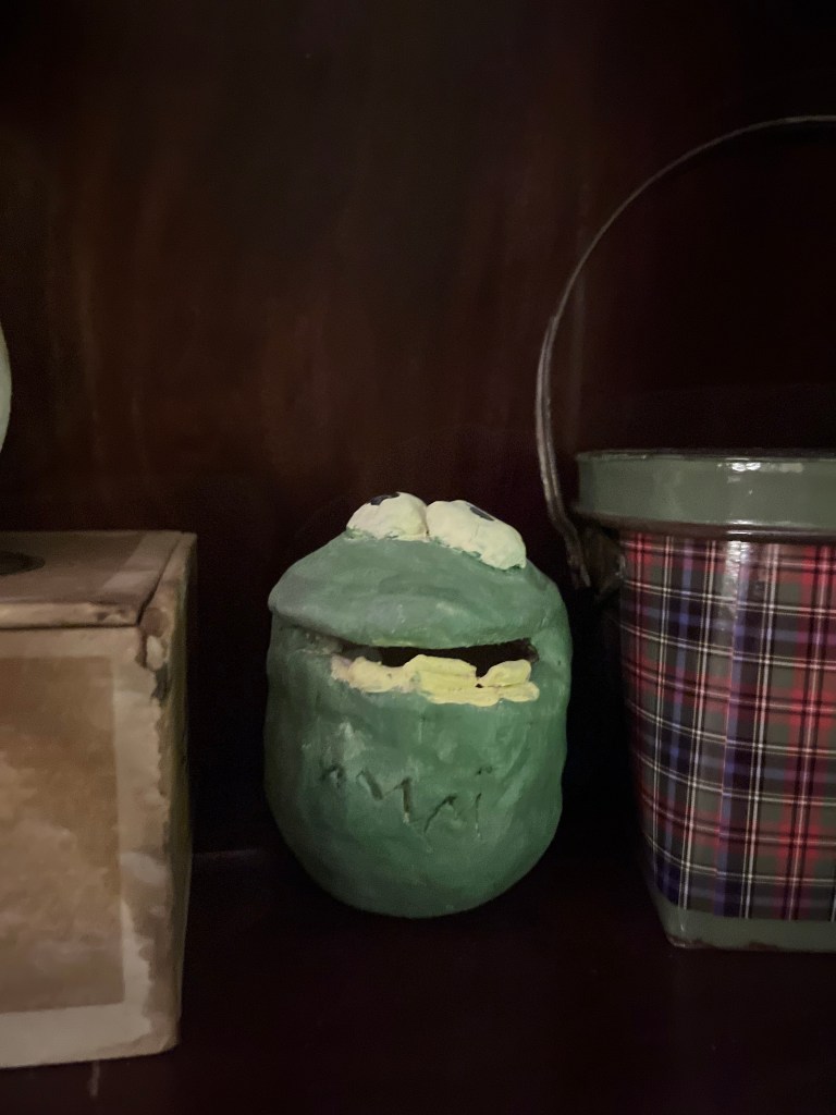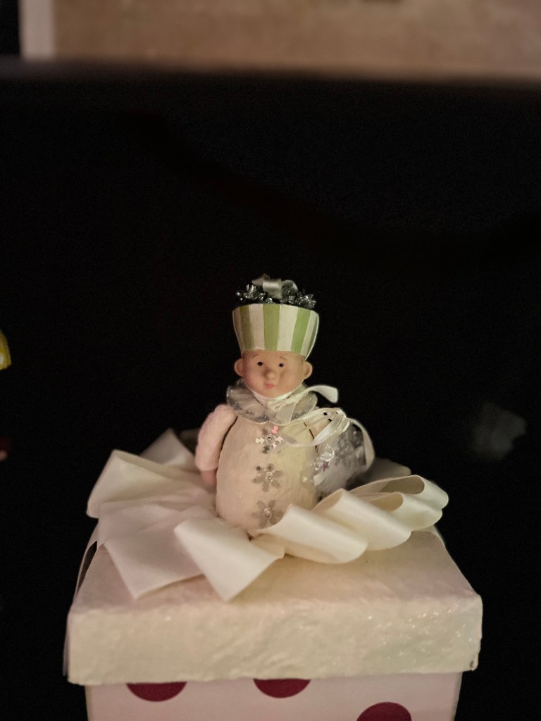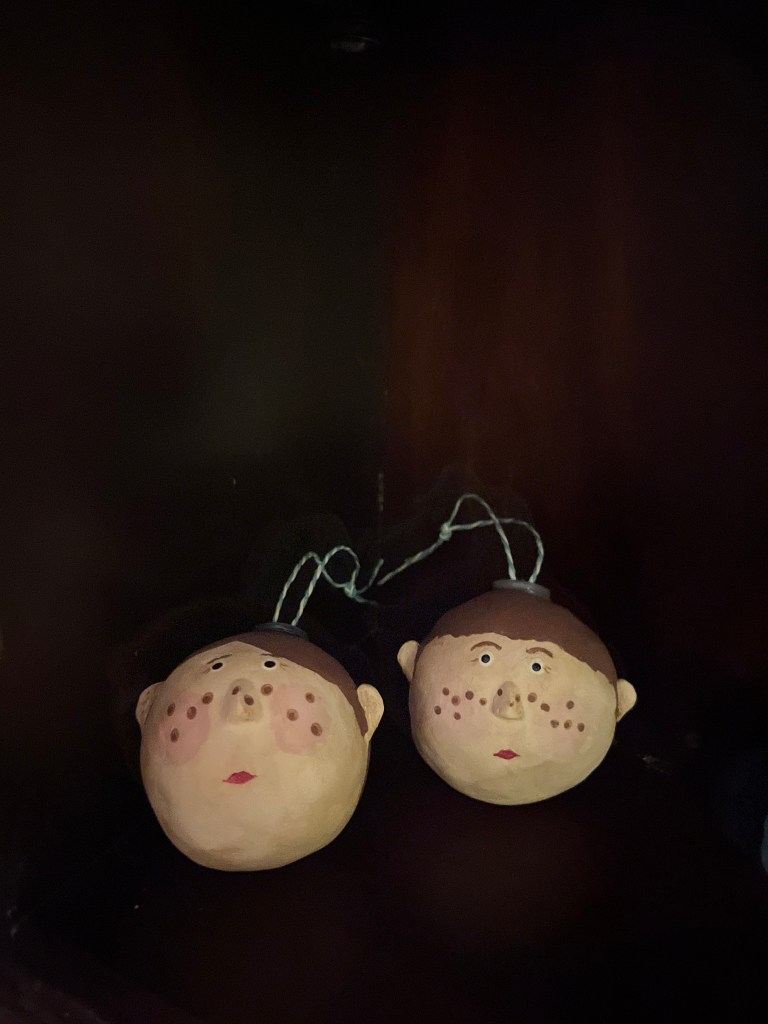 The first piece is Lark Spur Lane, made out of paper and baubles; it is an elf snowman that came with a story. The second picture is of two ornaments depicting my sons’ cute little faces from when they were little, made by me from paper clay and paint. The third picture is of a googly-eyed monster with big teeth, made by my son Max in school. All of these are sweet and form a cute collection tucked away behind glass doors.