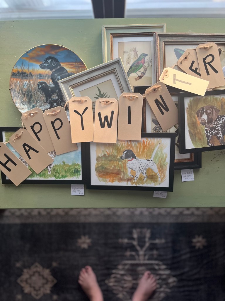 Yesterday I finished up some work that I will be taking to the antique booth this week. It is time to take Christmas down and add some new items. I made some banners to sell and framed some prints. I also framed some original paintings as well. My theme for one wall is going to be nature. I’m adding plants, birds, and dogs. This will create a big gallery wall.