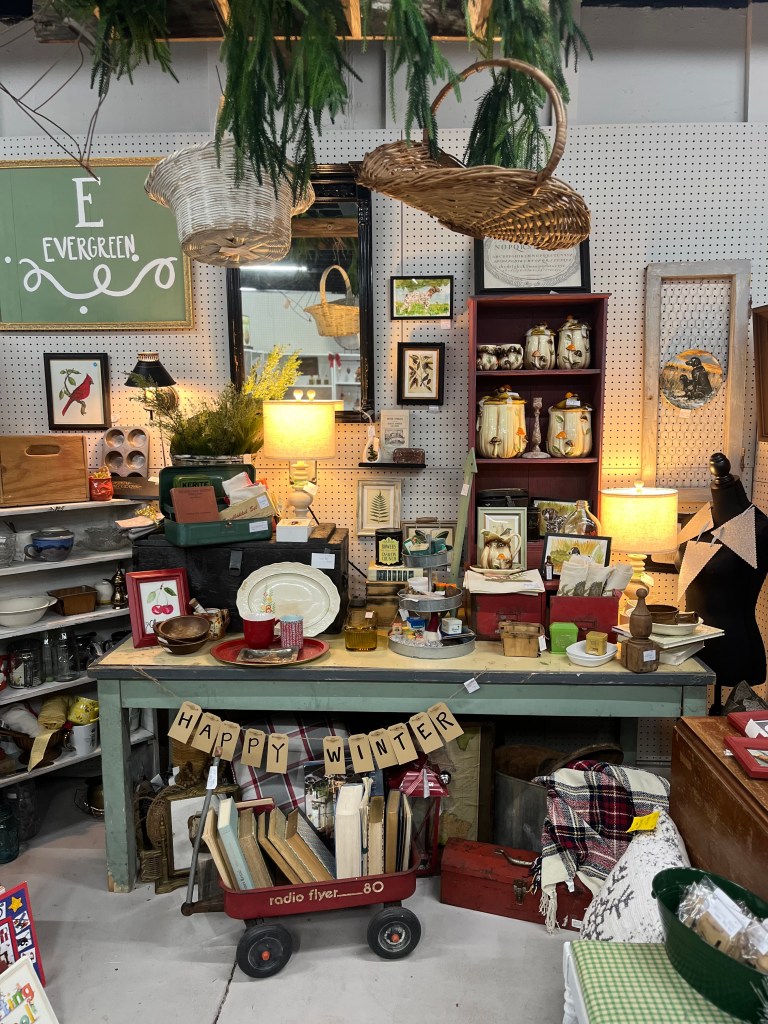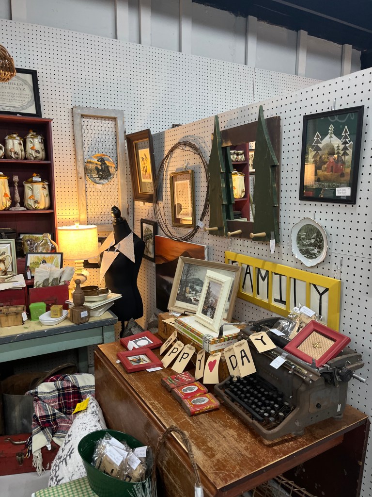 It’s another snow day here. Schools are closed, and the streets are blanketed in a thick layer of shimmering white. We definitely are living in a winter wonderland. If only we could give some of it to California; the devastation there is unbelievable, as you know, with the wildfires taking out entire communities. My prayers are for the safety of the people impacted by these tragedies. Yesterday was the first day I got out and about since Saturday. The roads in the village where I live haven’t been clear enough for me to venture out. I had a lot to accomplish, one of which was taking down Christmas decorations in our antique booth. I rearranged and added new items, still keeping winter themes up. I’m not ready to bring in spring quite yet. I love working in that little booth of ours; it feels like a creative outlet that brightens my days. It’s like having a small store without the headache of being there all the time. Our booth is fifty-fifty, fifty percent new and fifty percent old. Just how we like it, marrying old with the new in all our homes. While rearranging, I placed my nieces’ collection of mushroom canisters, cups etc. front and center, and by the end of the day, they all sold! How about that? Now to get there and change things up again. So fun! I did add some handmade banners for sale with cheerful messages like Happy Winter, Happy Heart Day, Happy Birthday, and Welcome Baby. They were fun to make and helped kill some time after the Christmas festivities. I also took in an old typewriter that would be lovely as a decorative piece in anyone’s home. And then there was a loop of rusty wire (I’m calling it a wire wreath because it does look so cool on a wall). I also added an outdoorsy mirror adorned with pine trees and those original dog pictures that I painted a while back. When I left, I felt happy because everything looked new and fresh.