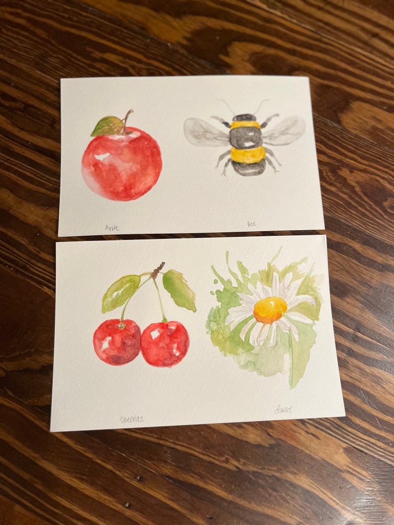 I decided to pick up the watercolors over the weekend. I thought it would be fun to paint an item that starts with every letter of the alphabet. So far, I have painted an apple, bee, cherries, and a daisy. The apple, cherries, and bee remind me of my Grandma Bea, who once lived in Spring Garden. She had apple trees and a cherry tree when I was growing up. I have heard about the peach trees; I guess they were long gone when I was young because I don’t remember them. We would pick apples from the apple trees. Somebody in my family would take a salt shaker and salt the green apples when eating them. I don’t remember who, though. The cherries that we would pick would make our lips pucker because of the tartness. We didn’t care; we kept picking them year after year. And the bee. In her later years, somebody gave Grandma a stuffed bee because her name was Bea. My niece’s middle name is Beatrice after Grandma, so I tend to buy her bee items to keep up with the tradition.