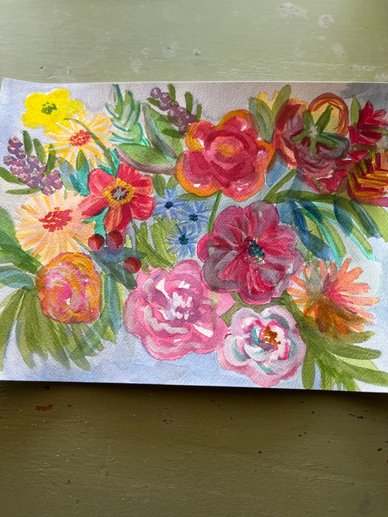 Hello, friend! Happy Friday. What are your plans for the weekend? I’m going to a couple of estate sales. I’ve decided to have a sale here next month of some of my paintings. Yesterday, I sat down to paint and created a bright, loose painting of flowers. I think the colors are fun for this time of year.