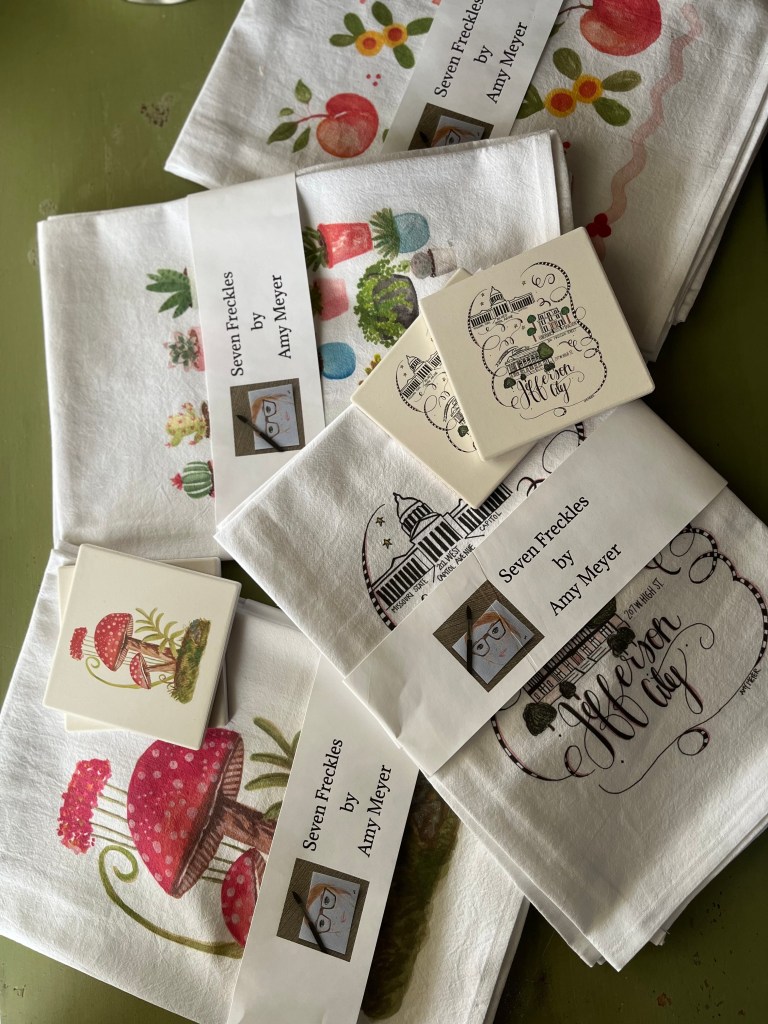 Hello friend! How are you this morning? Today is going to be a good day, I just know it. Some items came in recently for me to restock in my booth. I’ve had some requests for my Jefferson City, MO towels, so I reordered them. While I was at it, I reordered the peach towel, mushroom towel, and succulent towel. I also added two new products to the mix: Jefferson City, MO coasters and mushroom coasters. I thought that they might be a good gift: two coasters and a tea towel. They would make a great bridal shower, hostess, birthday, or Mother’s Day gift. I’m so happy how they turned out. I think the coasters will be an item that I will always carry in my booth.