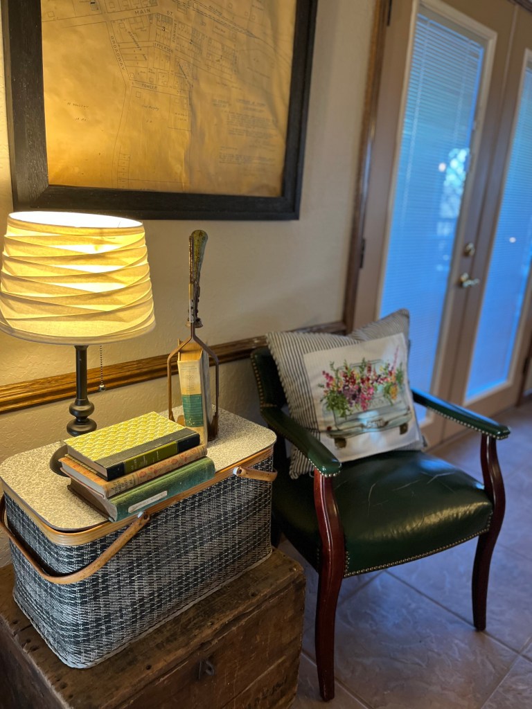The picture is a plat map of the village where I live from 1923 that was left in the house when we bought it. The books and picnic basket all came from estate sales. The wooden trunk is from a friend who gave it to me for my birthday once upon a time. And the old bottle opener is from a fellow vendor at the antique mall. I think it looks so cool with a book in it.