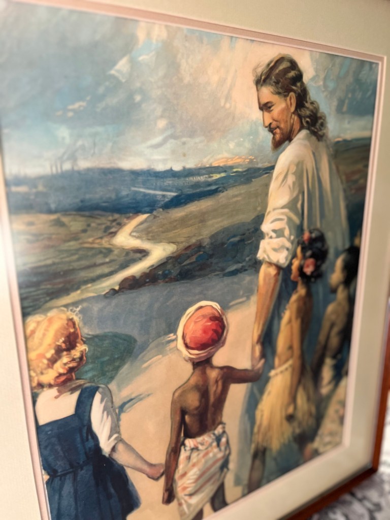 I’m thrilled with it. I’m still working on putting back pictures on our walls from having our house painted in November. I have taken my time deciding on what goes where. I purchased this picture of Jesus and little children the other day at the antique mall from a fellow vendor. I have loved it for some time now, so I pulled the trigger and bought it. Apparently, it used to hang in a church in downtown Jefferson City.