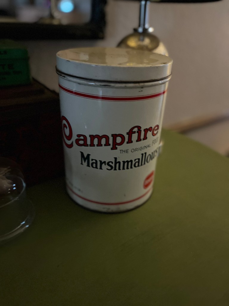 Yesterday, I went to lunch with my sister and two of my nieces. It was good to spend time with all three of them because I don’t get to on a regular basis. After lunch, we went to an antique place. We all love to find treasures; it’s in our blood. The nieces found a couple of vintage postcards and a small turtle planter. I found an item that I have been on the hunt for for some time now: a Campfire Marshmallow tin. I am thrilled.