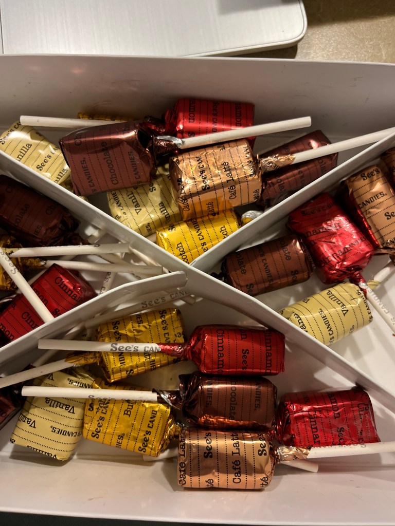Mr. Handsome took the day off to spend with me. I didn’t ask him to; he just did it. What a gift! We are going to a town about an hour away to thrift. I think this is our favorite pastime. I am excited about the treasures we might find, and I’m excited to just spend time with him. So if you watch on stories I will try to post some of our finds. Last night, one of my boys gave me a present. He did so because today he has school and work and was afraid he might not see me. We have this thing for See’s lollipops, so he bought me a whole box full. What a surprise! The other son came in late from work, and I was already sleeping. He left a card on the island with two gift cards in it. Such a sweet gesture.