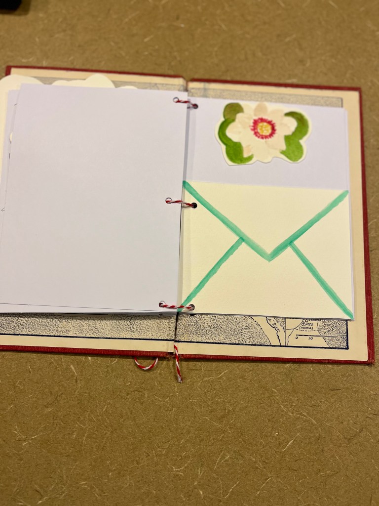 I used an old book cover for the cover of this scrapbook. I decorated it with tiny watercolor paintings that I painted and cut out. Inside, I attached all the pages with string.