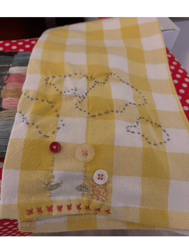 Hi Friend! Yesterday I decided to try to sew little stitches on a yellow and white checked tea towel, and it turned out to be fun. I love how people sew all over fabric without a plan or pattern, embracing creativity and spontaneity if you will. It’s fascinating to witness the beauty that unfolds when someone allows their imagination to guide their needlework. I don’t know exactly what I am doing; I’m just sewing all over, trying to master different stitches and techniques, experimenting with what looks good together. The process is so freeing, and I find myself lost in the rhythm of the needle and thread. I will look up stitches on the gram later, so I can learn from others and gather inspiration for my next project. Engaging with the online sewing community might just spark new ideas and techniques that I haven’t yet considered.