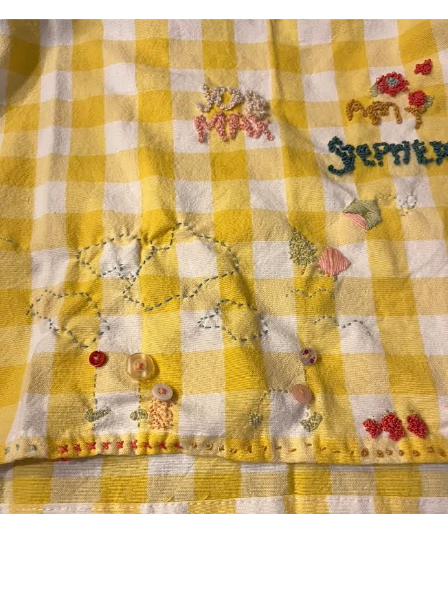 Remember this from a few weeks ago? Every little bit of free time I add something to this tea towel, letting my creativity flow freely as I choose different colors and patterns to stitch into its fabric. I like the free form of it; there’s an exhilarating sense of freedom when I allow myself to deviate from standard designs and let my imagination take the lead. Is it perfect? No, but that’s the beauty of it. It is fun to sew without a pattern, embracing the process.