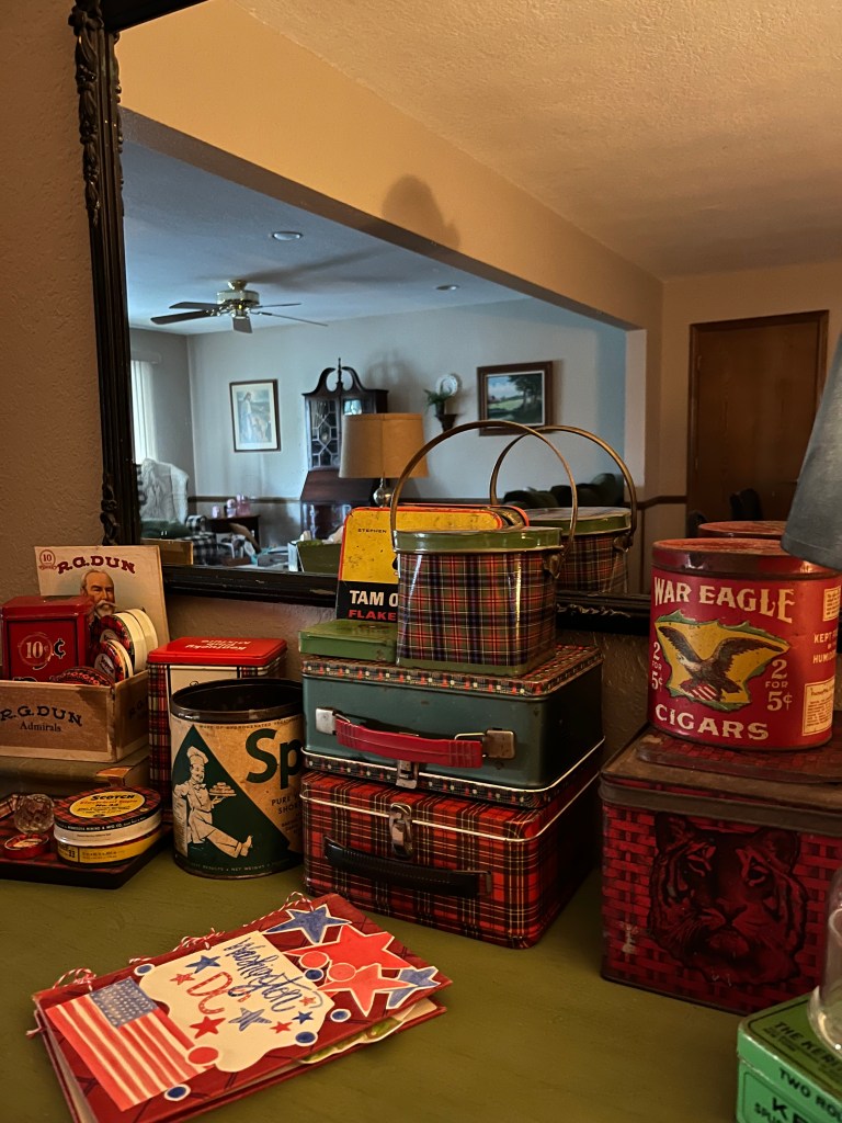 I added some of the tins that I purchased to my collection, which has been growing steadily over the years. If you will notice the War Eagle tin, which is particularly striking with its vibrant colors, there are also two other tins that I purchased on our trip in this picture, each with its own unique design and story to tell. I am not one for tobacco use, but I do love the artwork that is on the old tobacco tins, as they showcase the craftsmanship and creativity of a bygone era. The designs and bold typography of these tins capture my eye.