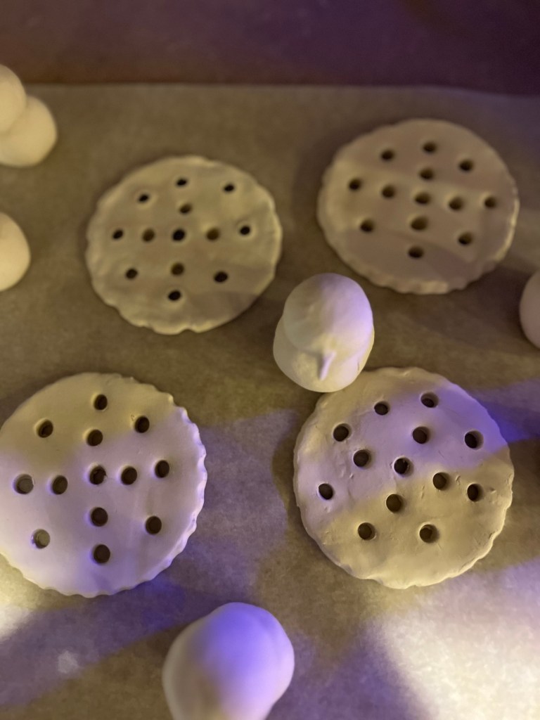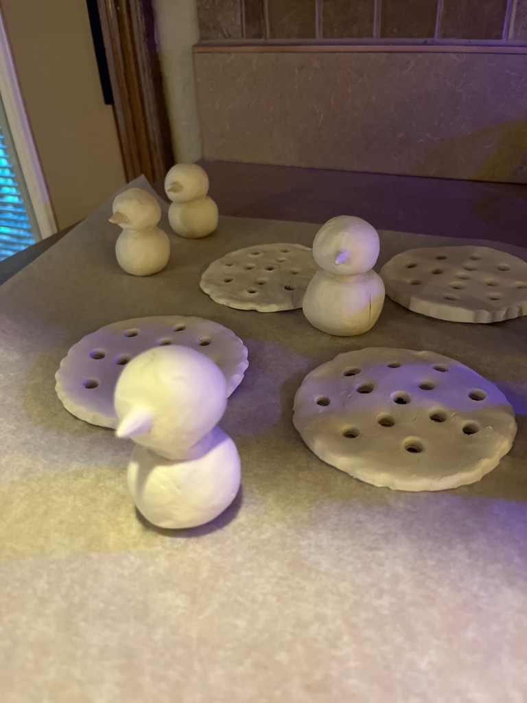 In the mean time, I took time Sunday afternoon to craft. I made some flower frogs, snowmen, and oak leaves. The flower frogs and snowmen are made of clay. Some of the snowmen cracked overnight while drying, which is always a bit frustrating, but I will add clay to the cracks to mend them and restore their charm. Hopefully, by Wednesday, I can show you some final projects that I’m excited about. The oak leaves are going to be a wreath for the booth, tying in with a cozy theme that I envision for the space, filled with warmth and seasonal spirit, bringing a touch of nature indoors.