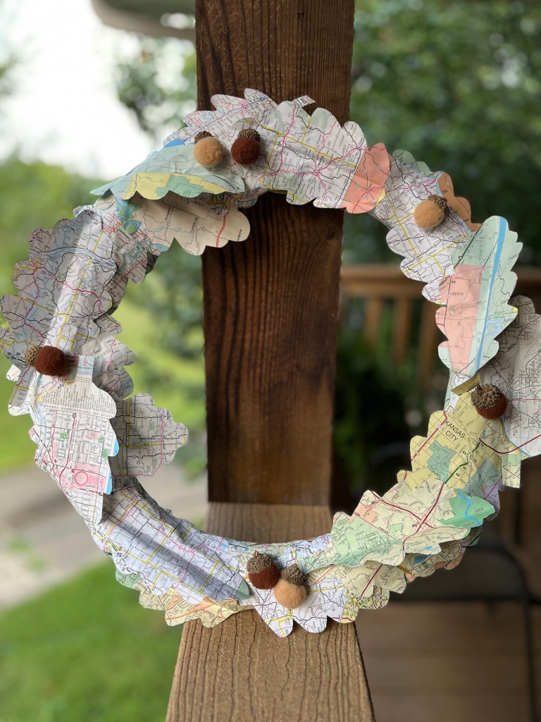 I did, however, use the oak leaves that I had cut out of a map to make a wreath. The leaves are glued onto a foam form with white school glue to ensure they stay in place. To enhance the rustic feel of the wreath, I purchased acorns at Hobby Lobby, which I then glued on with hot glue for a sturdy hold. I am planning to add the wreath to my cabin display that I will be putting together tomorrow, along with other handmade items that reflect the beauty of the outdoors. So, stay tuned to see the finished product of the artwork I’ve done lately, including this unique wreath that embodies the essence of autumn. Hopefully, I won’t forget to take a picture to capture this moment and share it with you here. Who knows the way my brain has been working lately.