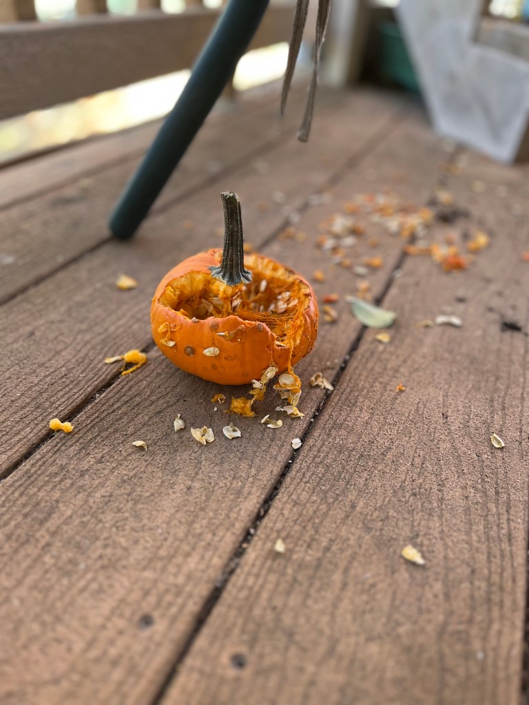 And finally, you know those little visitors we have on our deck daily? Well, this is the result of them visiting the other day. It’s always a joy to watch them flit about, exploring every nook and cranny. Glad they could feast upon the pumpkin that Mr. Handsome and I grew this summer. Watching them enjoy the fruits of our labor reminds me of the beauty of nature.