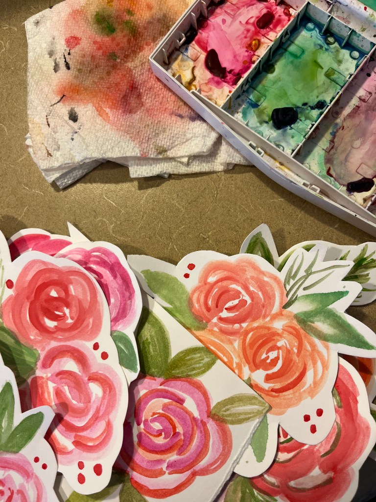 Saturday, I moved slowly, puttering around the house, being creative and cleaning a bit. I borrowed an audiobook through Hoopla, Dead Winter Bones by Anna Penrose, listening while I painted roses to put on some cards for some dear friends.