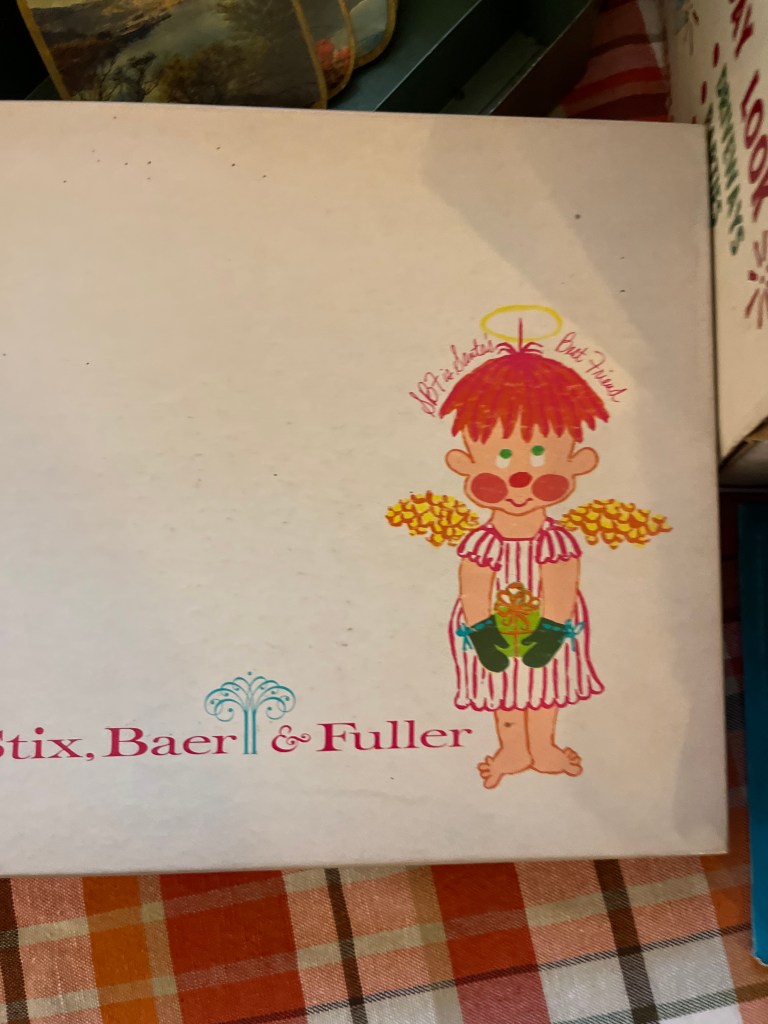 This cutie is a box from Stix, Baer, and Fuller. It says SBF is Santa’s best friend. It will go good with my Christmas display next year.