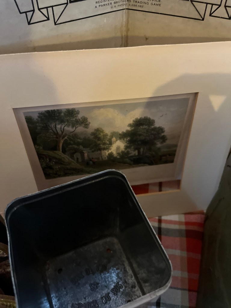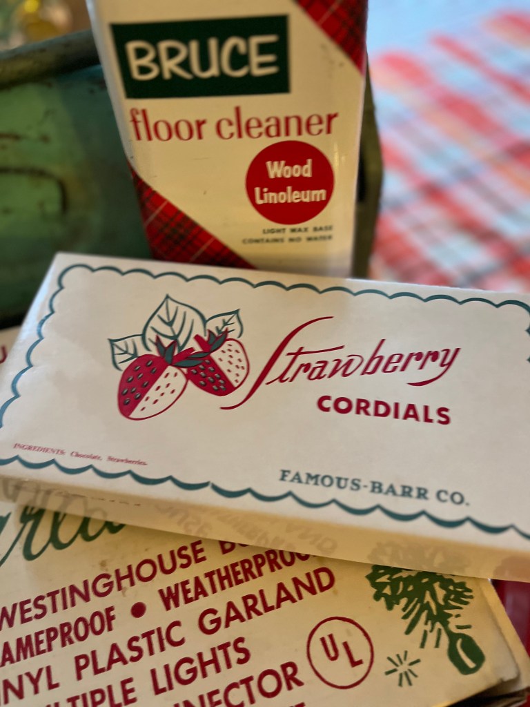 The floor cleaner tin caught my eye because of the plaid. Somebody will love this for their collection. I bought two of the strawberry cordials for display for Valentine’s Day. Don’t you just love the graphics?
