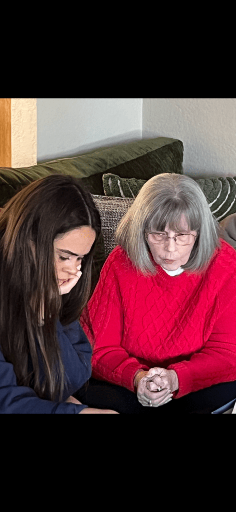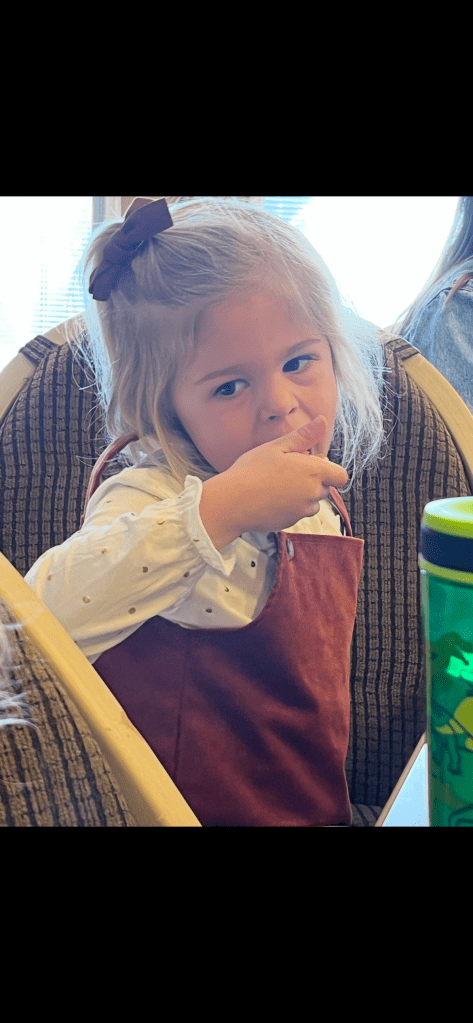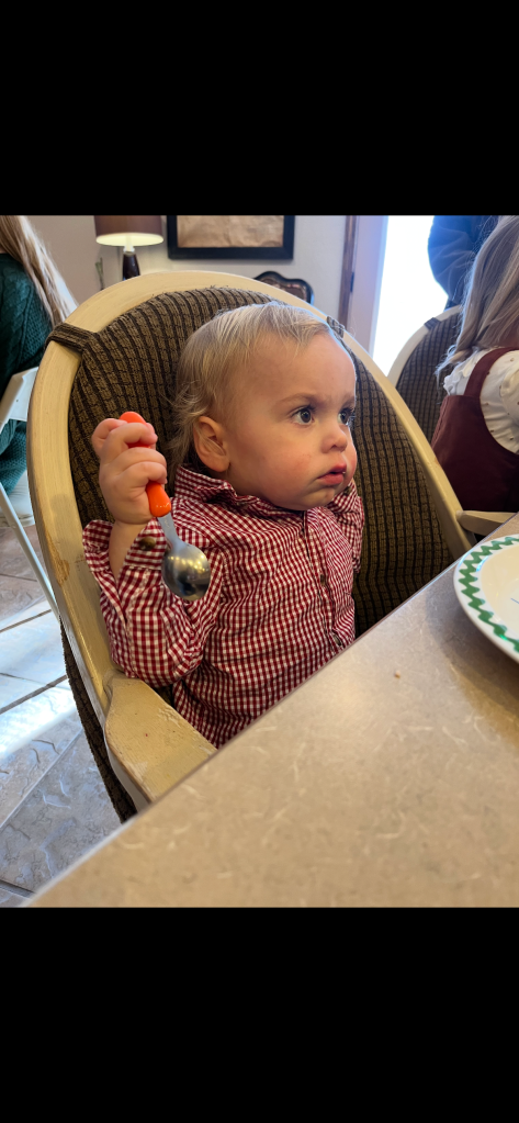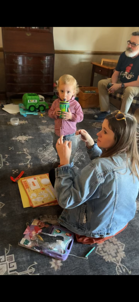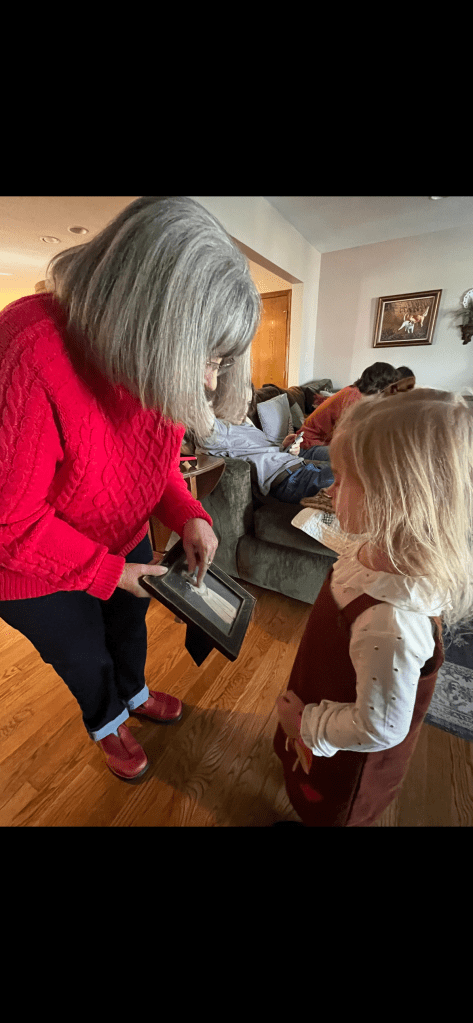 Scout is going to be a flower girl in summer ’26. My Mom is showing her a picture of herself as flower girl many years ago.
