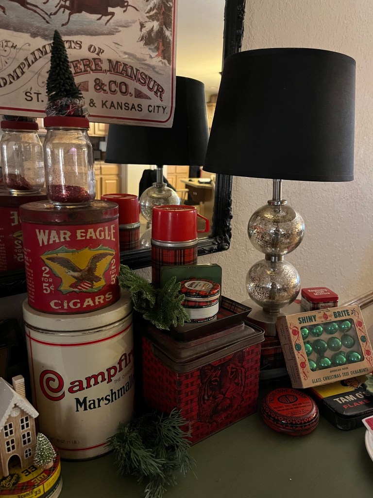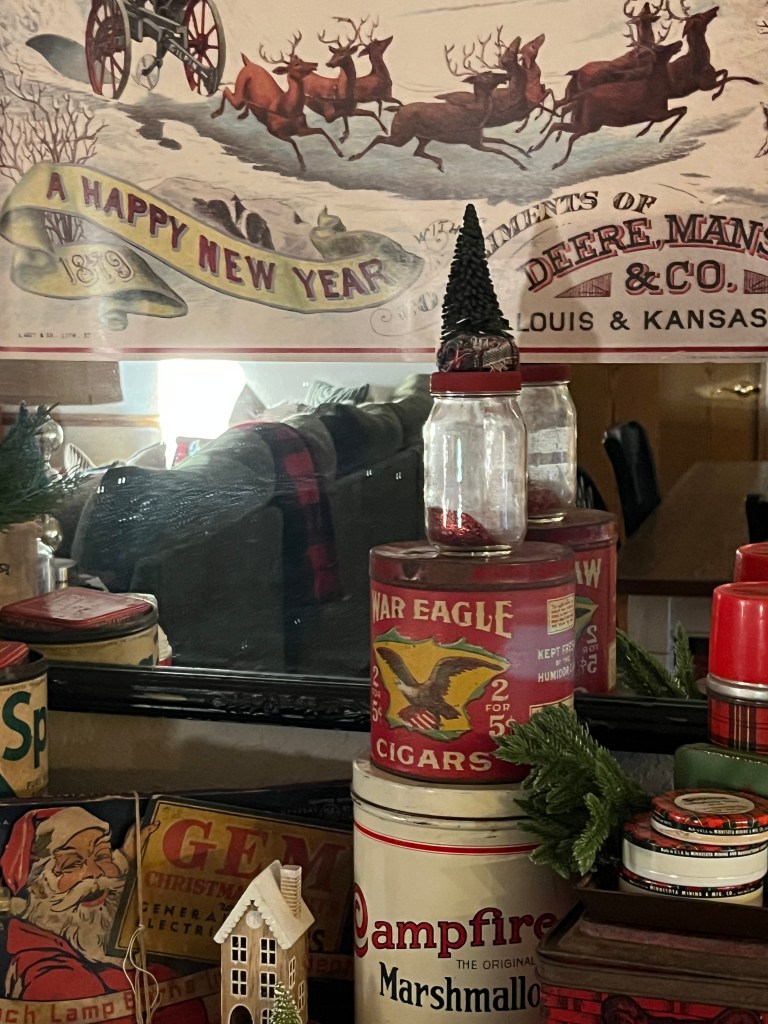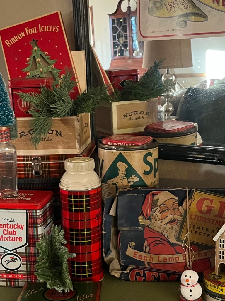 I added to my plaid collection by getting out pine sprigs, a snowman, a vintage light box, vintage icicles, and Shiny Brite ornaments.