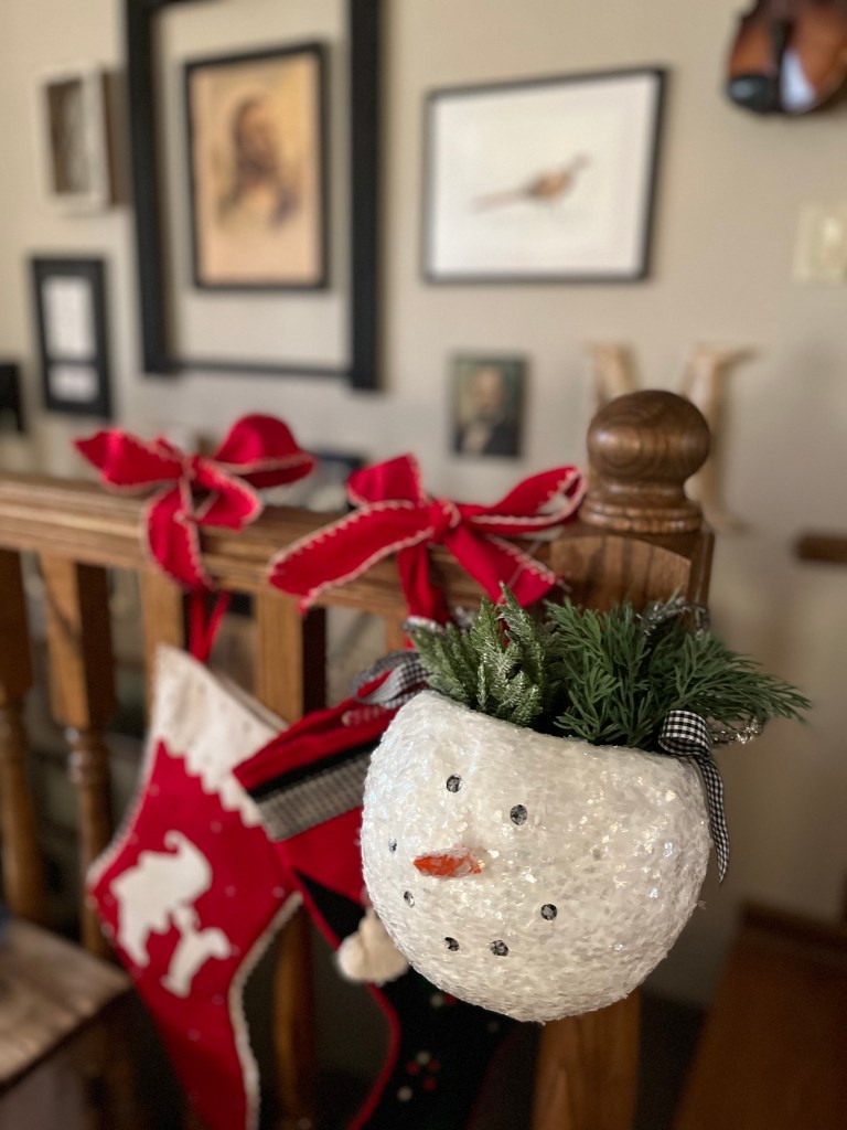 Since we don’t have a fireplace, I hang our stockings on the railing that leads downstairs. This year, I hung one of my snowman buckets there, too.
