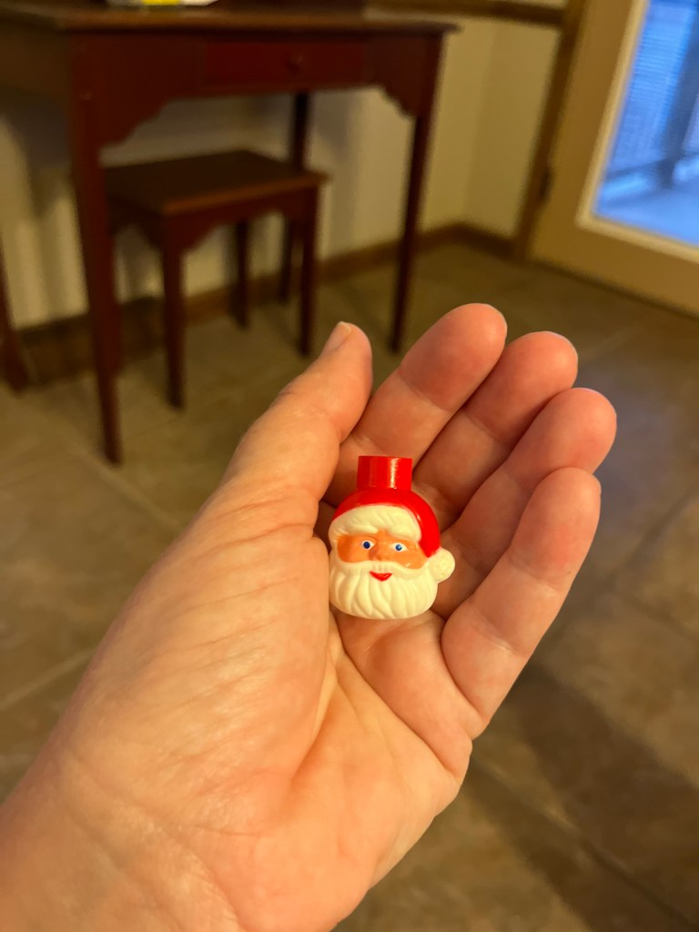 While at the antique mall I shopped a little. I can’t get away from there without something, it seems, as each visit leads me to find a hidden treasure. This time, I purchased tiny vintage blow mold Santas that fit on the traditional Christmas lights, not the new LED versions. The package has 40 Santas in it, I’m not sure what I am going to do with them yet, but their whimsical appeal makes me consider various possibilities. I might decorate my booth with them next year, incorporating them into a festive display that captures the attention of fellow shoppers. I just thought they were so cute, and their cheerful presence is sure to spread holiday joy wherever they are placed.