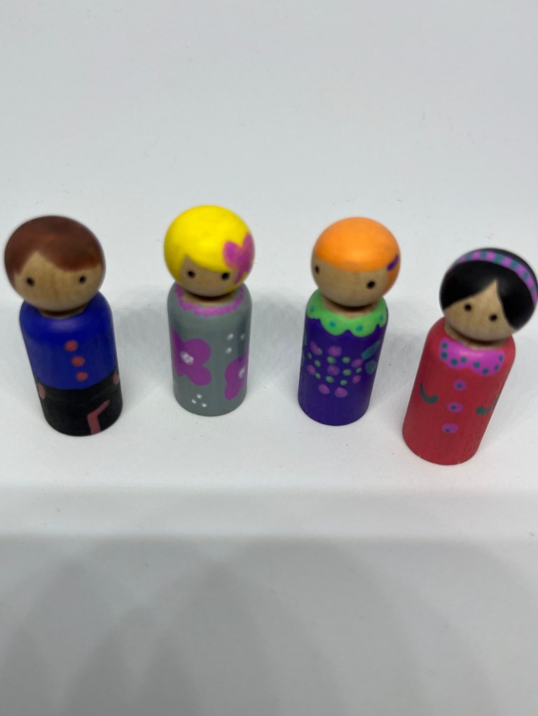 Well, it is Friday and in my last post I mentioned painting peg dolls that I hadn’t finished in time to show you. I finished up some sets and I love them. I think about the little girl, Amy, who would have loved them too. So without further ado, here they are…