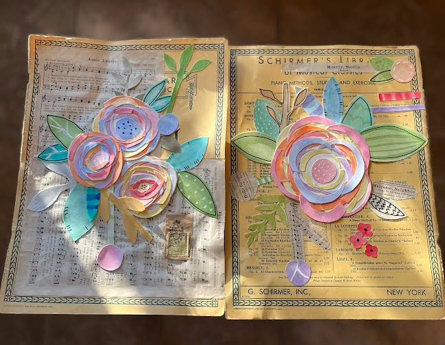The yellow-toned paper is the cover from old piano music, giving it a nostalgic charm that speaks to the past. There are some pages from another small piano book that was falling apart, probably because it is from the early 1900s. Among these items, there is also an eight-cent stamp that I found among some papers I purchased from an estate sale. Do you remember when postage was only eight cents? I don’t, not in my lifetime, but the thought of it brings a certain warmth. The flowers and leaves are cut from small pieces of paper that I water colored and then glued together. I think these will be fun framed and hung up in a person’s house that likes whimsical things. What do you think?